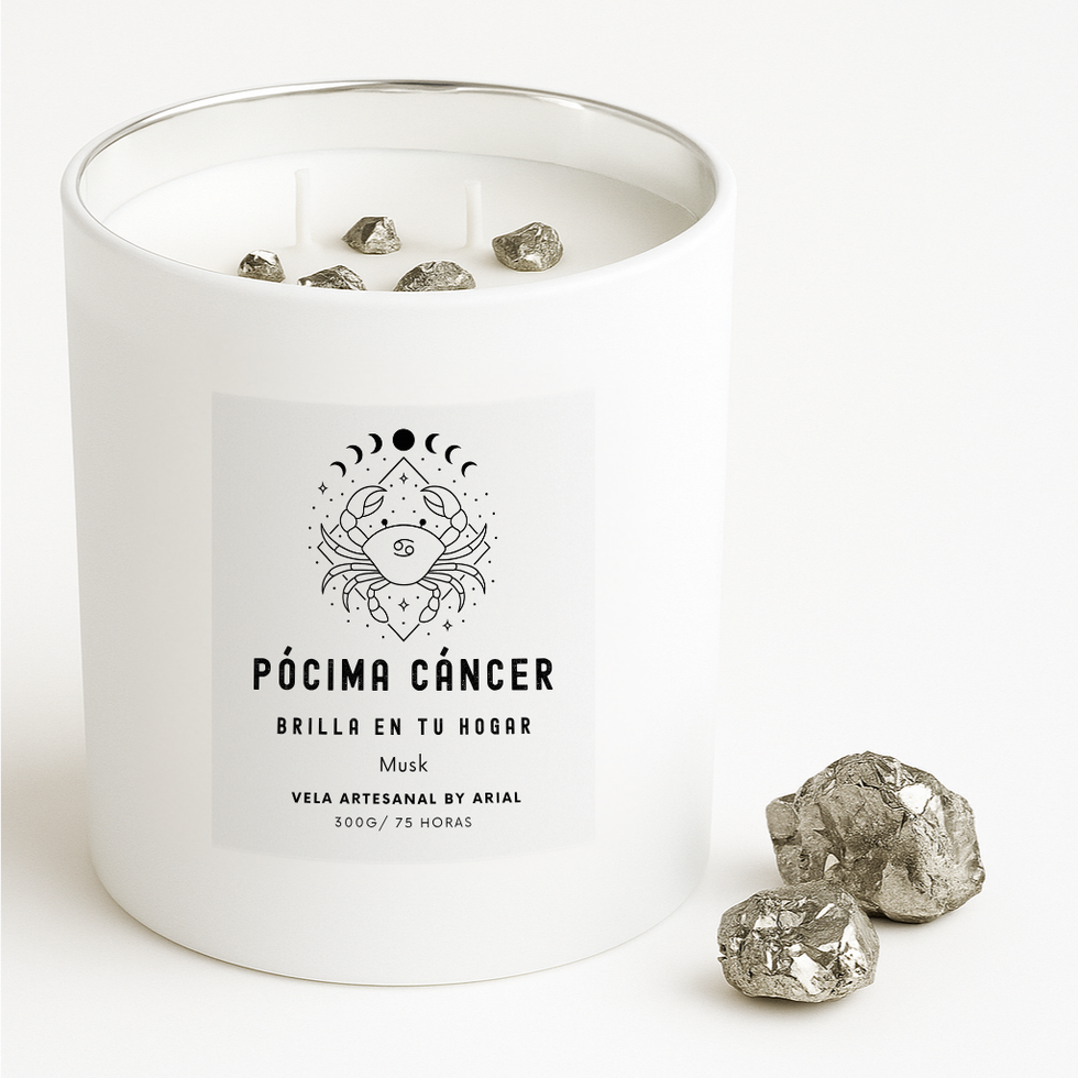 En su superficie, pequeñas piezas de Pirita Natural resplandecen como amuletos de energía y enfoque: piedra del éxito, la claridad y la fuerza interior. Su aroma a musk (almizcle) envuelve el espacio con notas cálidas, limpias y atemporales que equilibran la calma con la determinación.